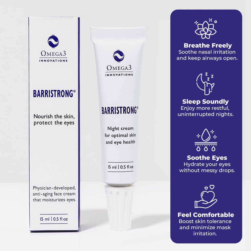 Barristrong® is the nightly cream made for CPAP users. It calms irritated eyes, soothes tender skin, and eases nose stuffiness so you can wear your mask longer and finally wake up feeling your best.